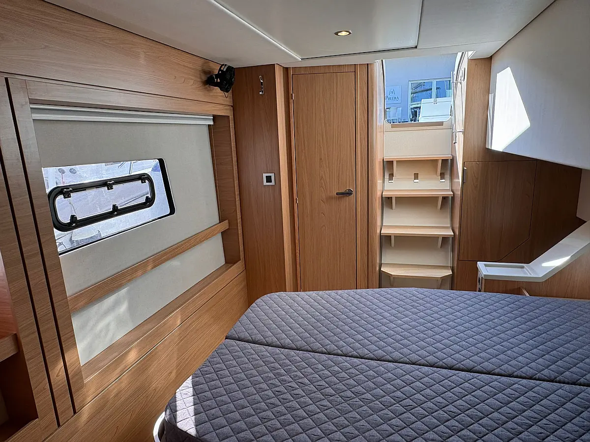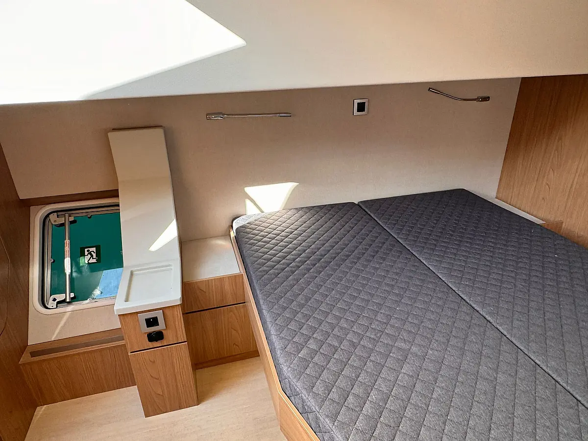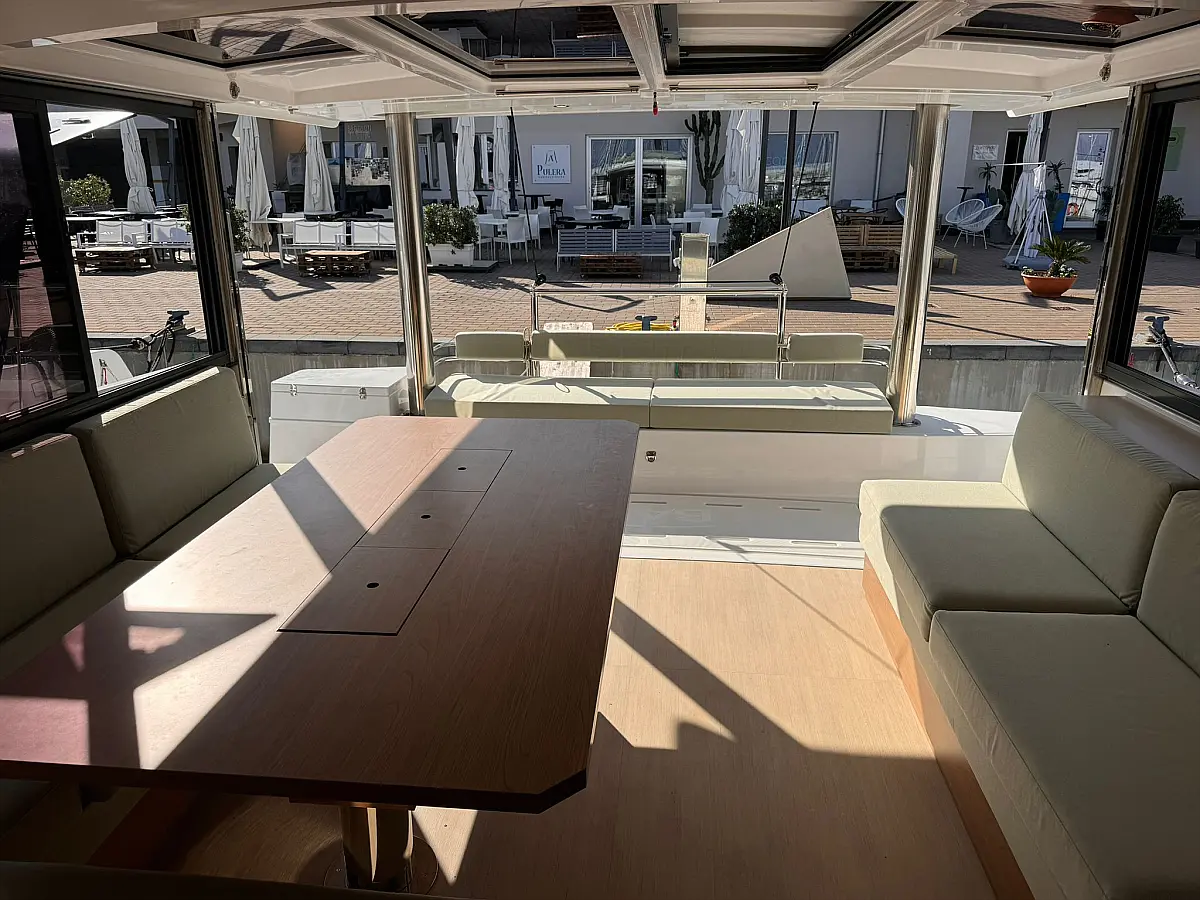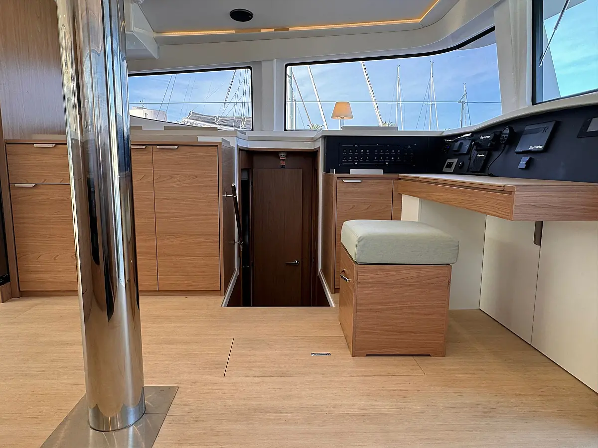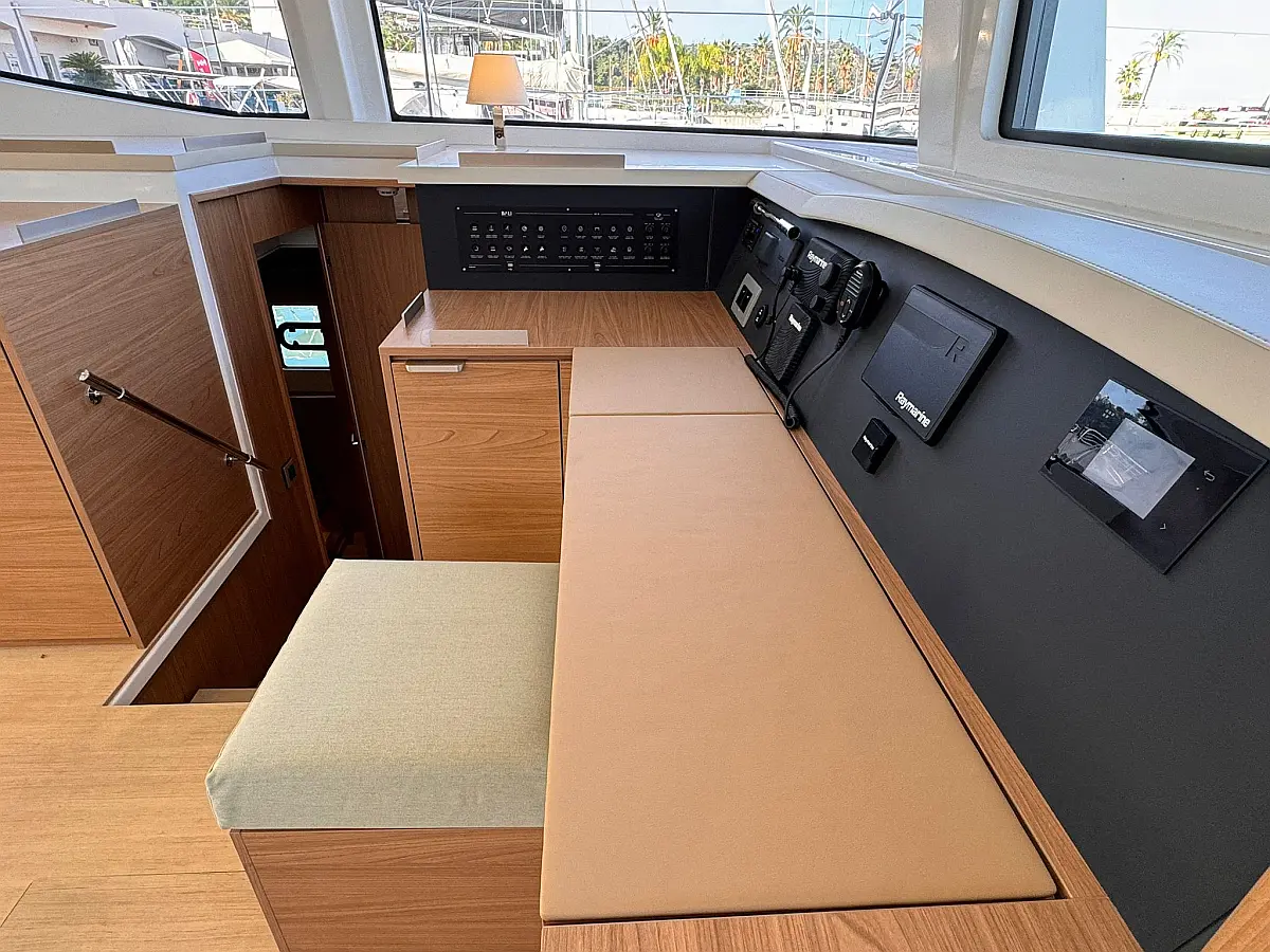 Solar panels, Skipper toilet, VHF radio, Wind indicator, Cabin fans (null), Cockpit table, Gas stove oven, Fridge, Microwave oven, Safety equipment for 12 peple, Lazy bag, Autopilot, Barometer (1), Bimini, Electric bilge pump, Electric winch (null), Flybridge, Electric windlass, GPS plotter, Inverter, Tender and outboard